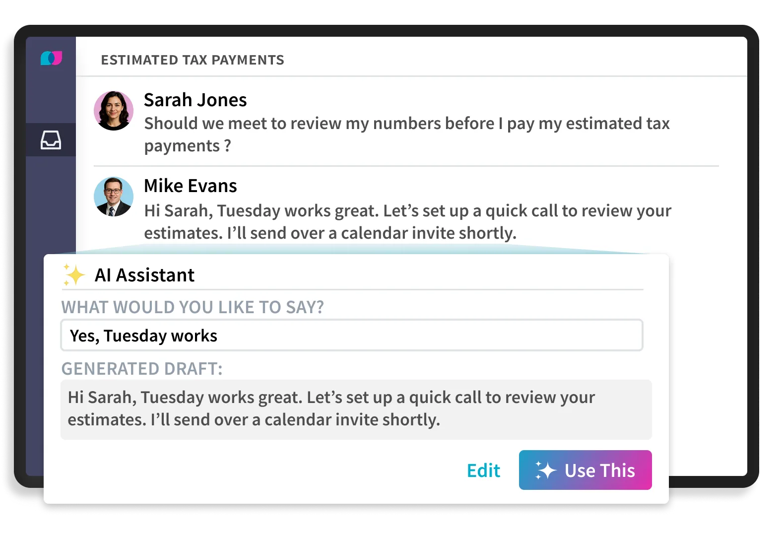 AI-powered message generation that's secure, conversation-aware, and built specifically for accounting workflows.